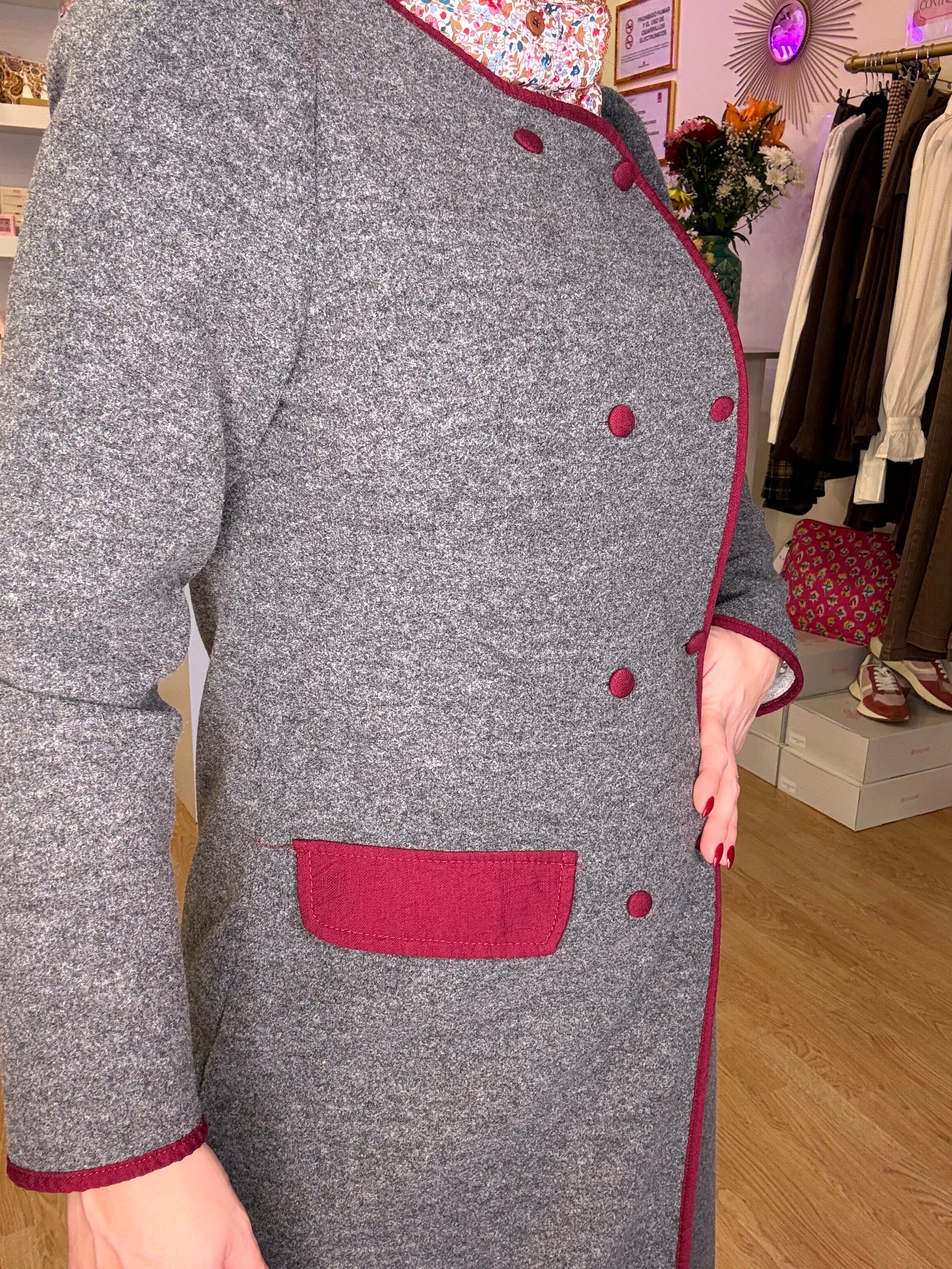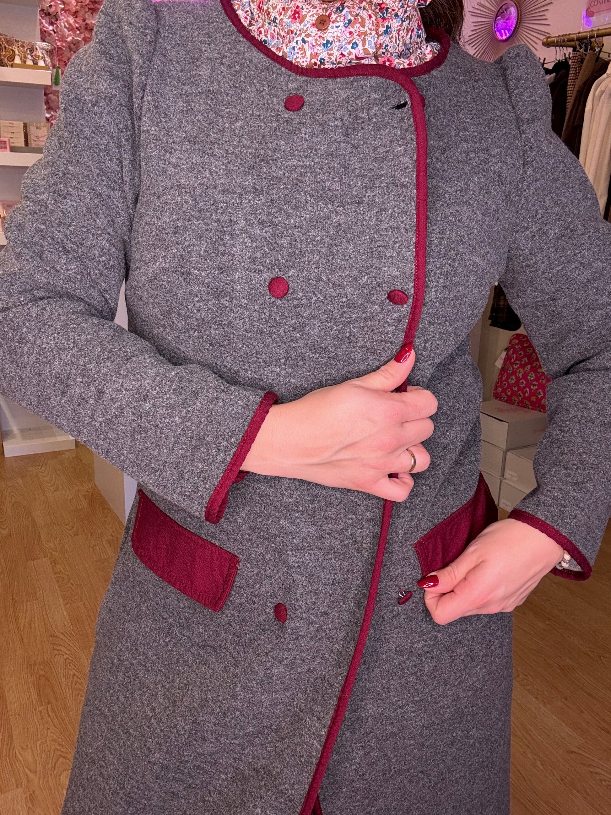 Destaca por su doble botonadura frontal, que aporta estructura y un aire sofisticado, y por los vivos en color burdeos, que hacen un contraste divino con el gris jaspeado del tejido. También cuenta con bolsillos decorativos en burdeos, que dan un toque moderno sin perder la esencia clásica.