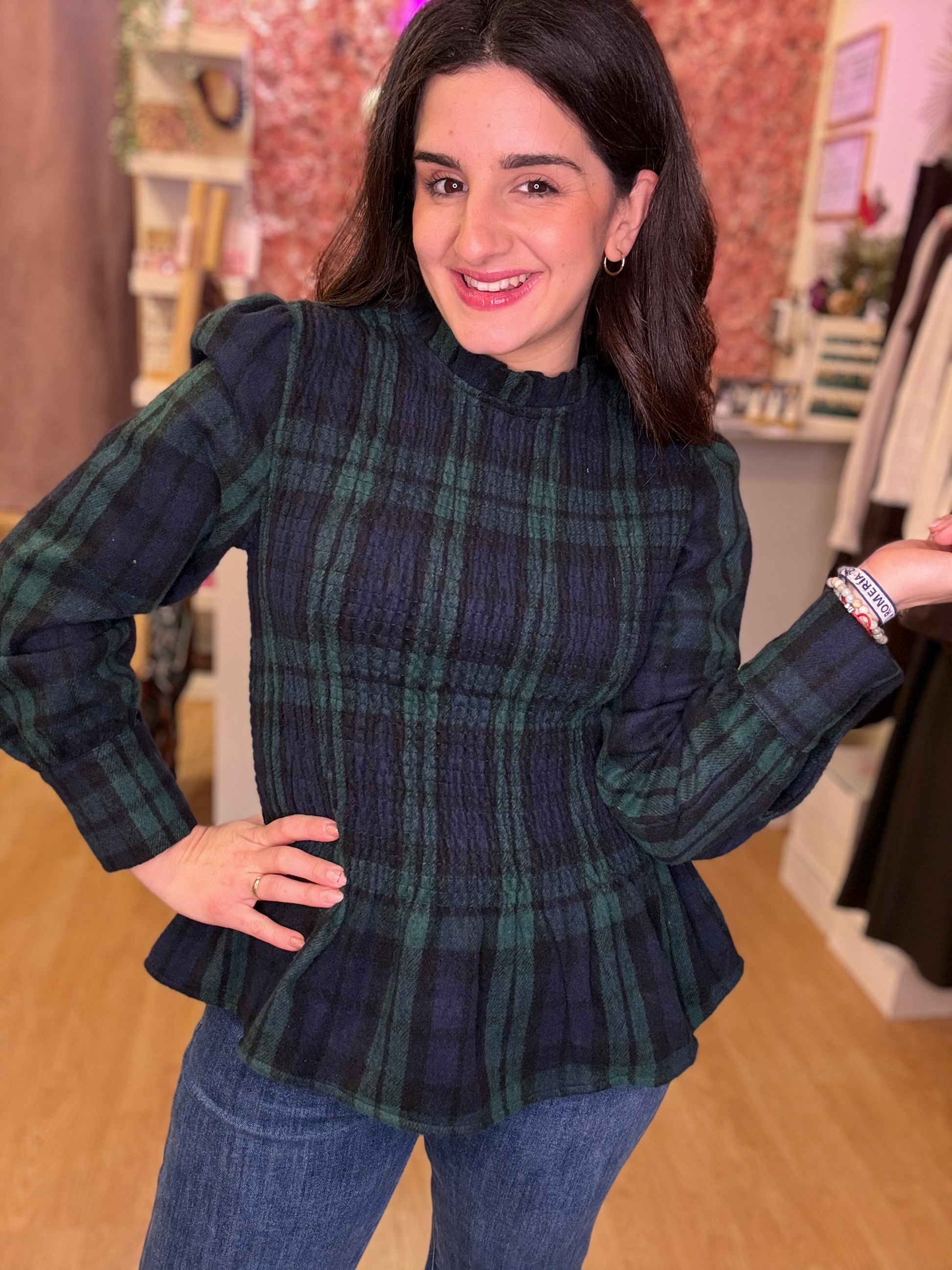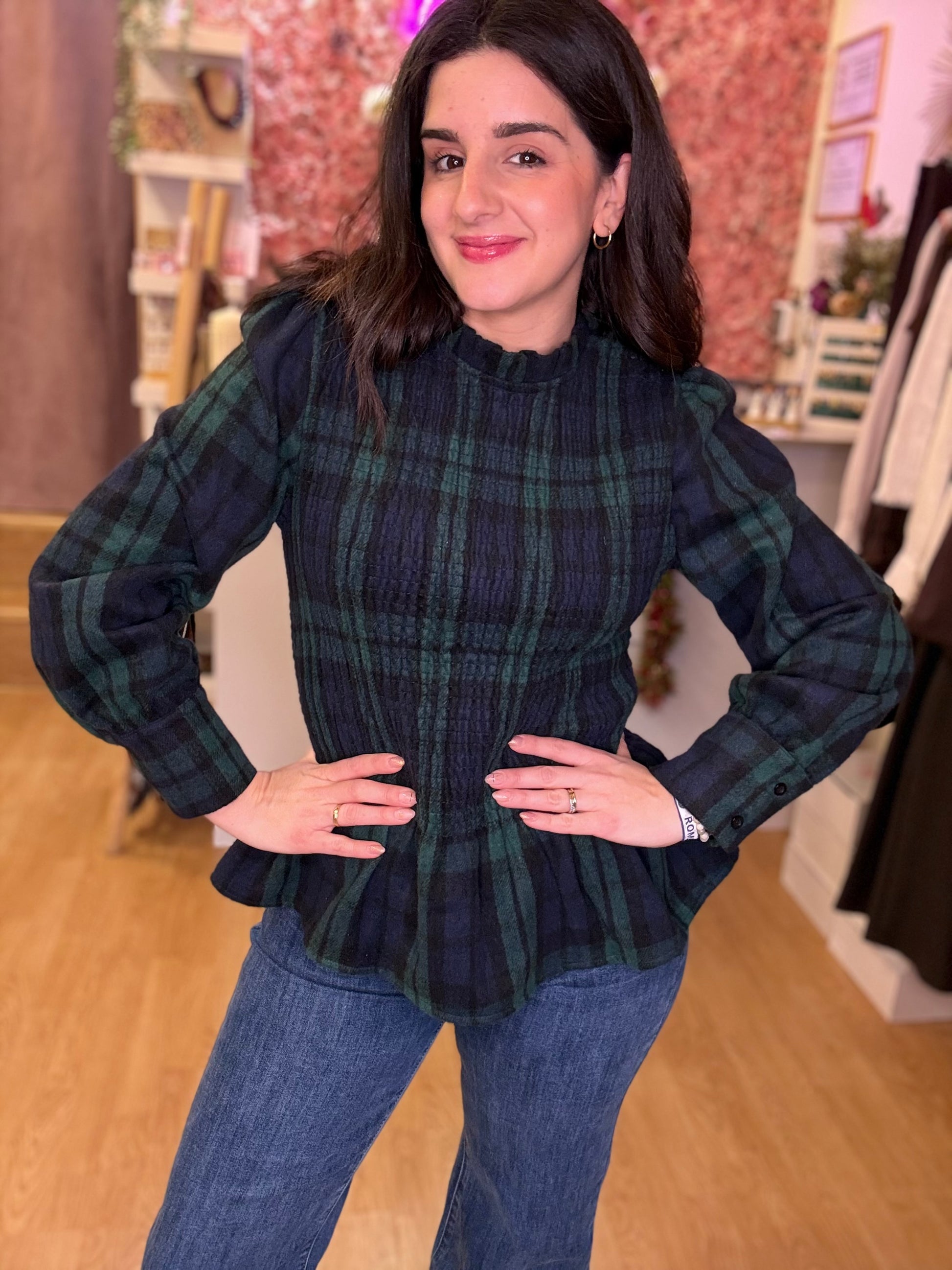 El cuadro en tonos verdes y azul marino aporta calma, elegancia y un punto atemporal que combina con todo. Su diseño, con frunce en la cintura, dibuja la silueta de forma delicada, realzando la figura sin apretar, mientras que el cuello ligeramente fruncido y las mangas con volumen añaden un aire femenino y cuidado al detalle.