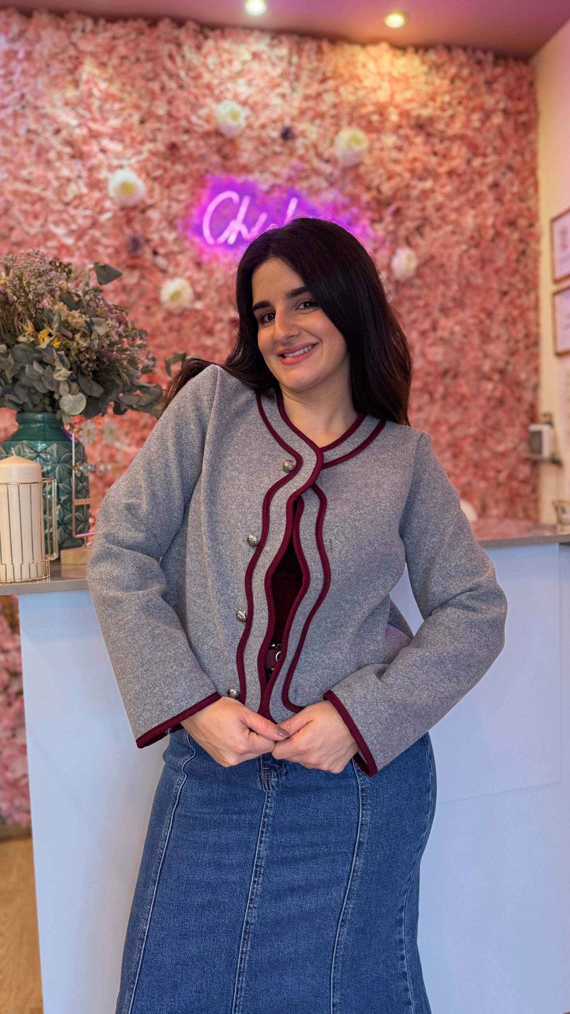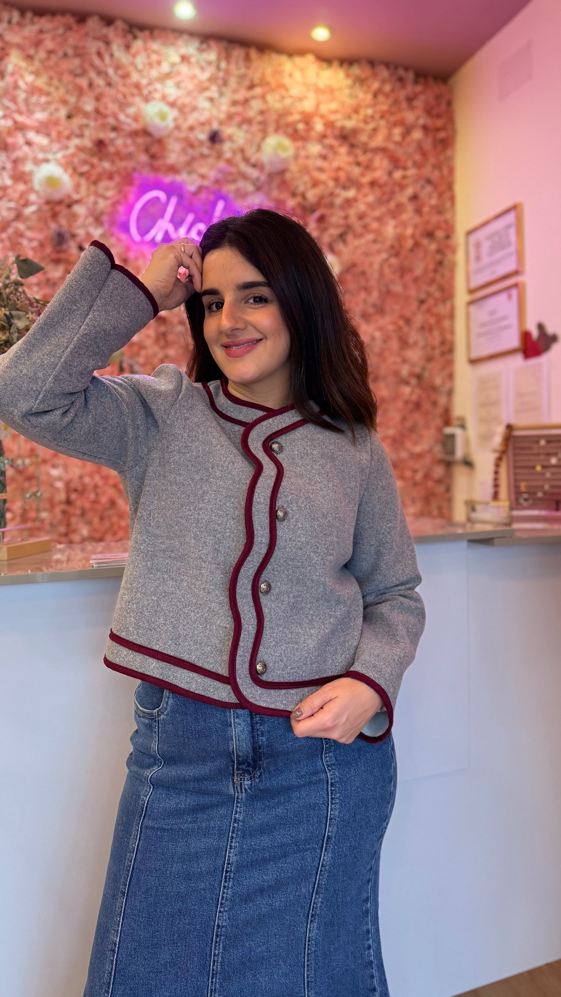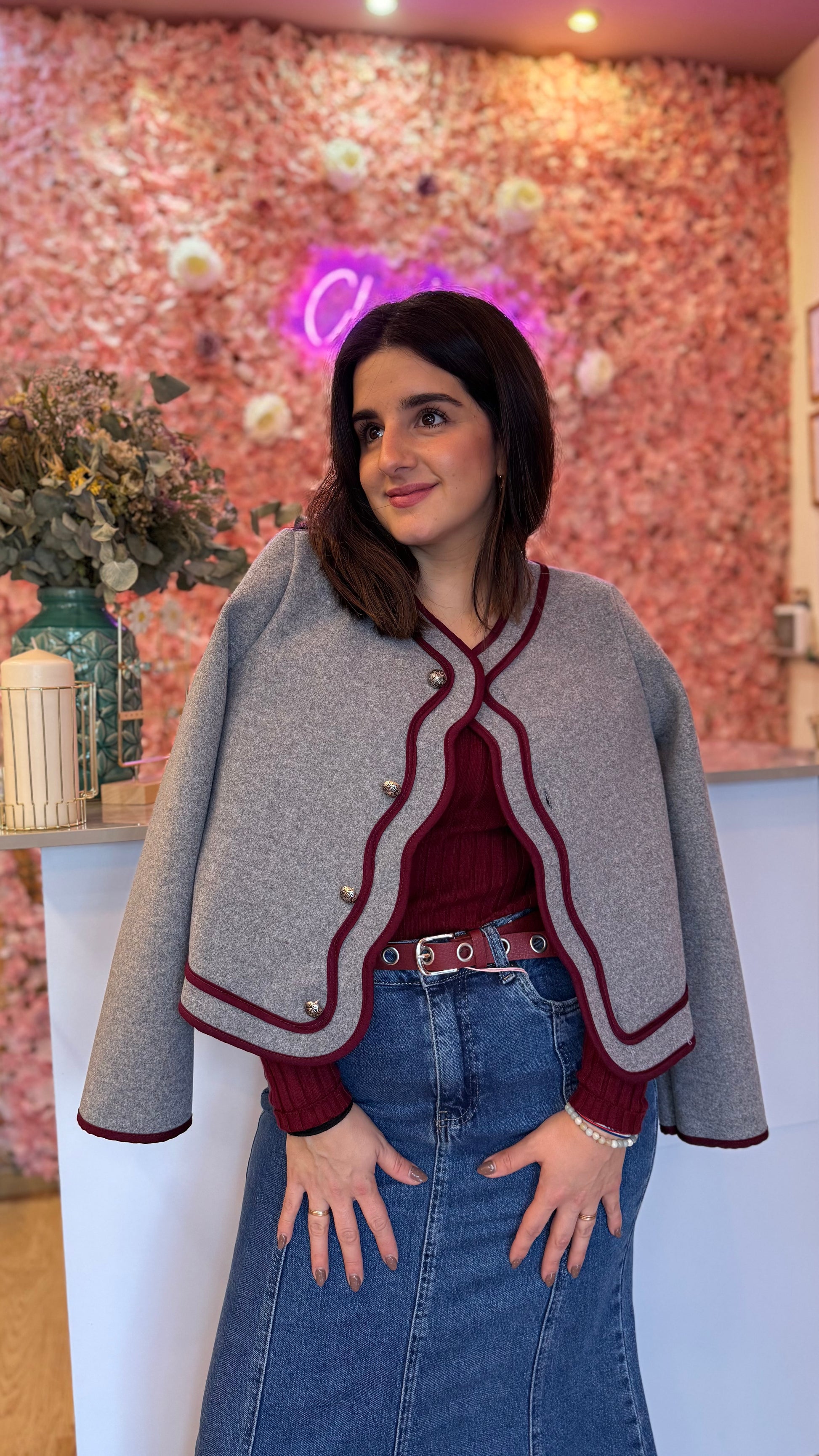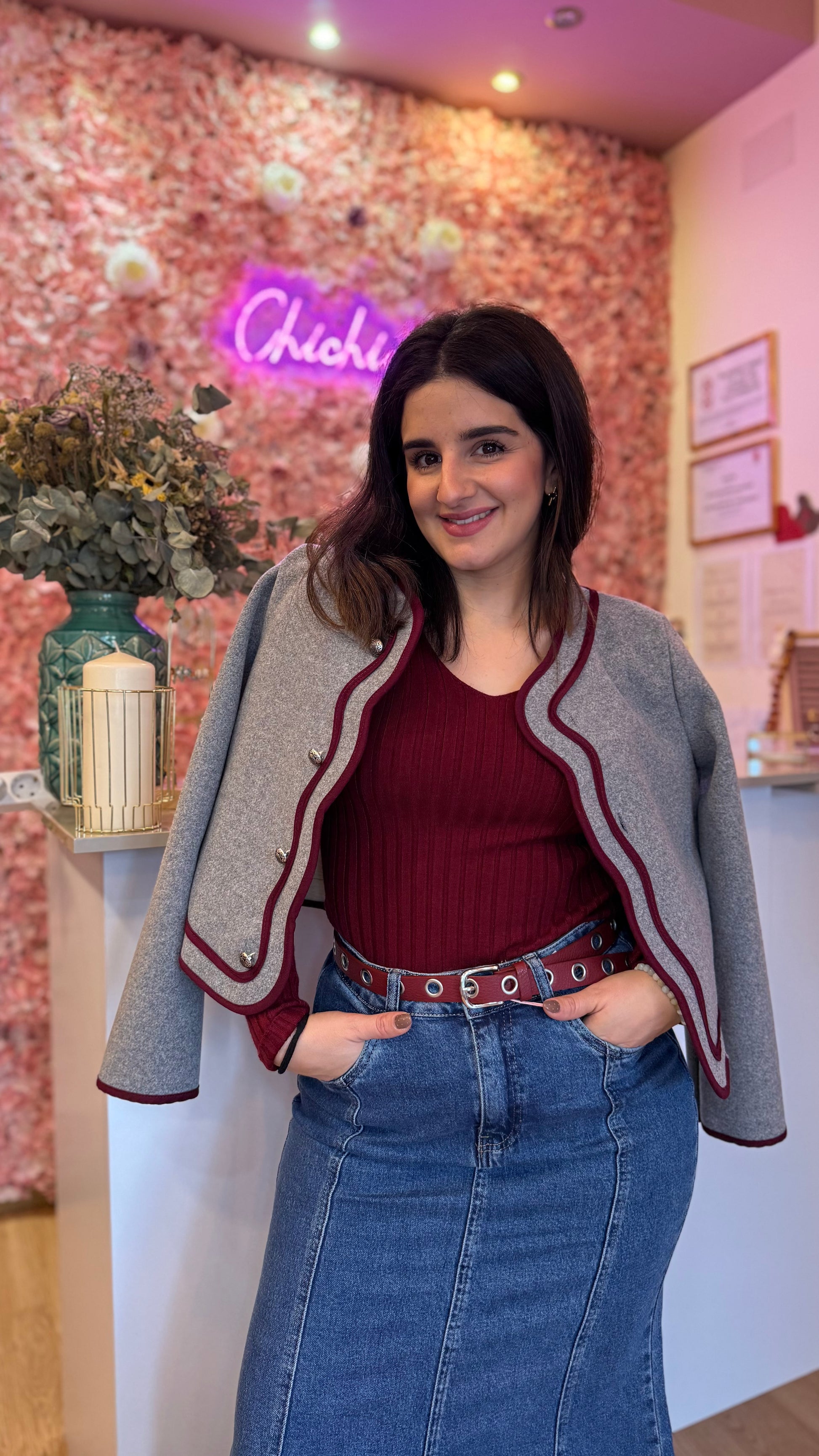 Inspirada en el encanto alpino, la chaqueta Tirol combina tradición y estilo contemporáneo. Confeccionada en 100% lana, ofrece una textura cálida y estructurada que envuelve sin pesar. Su diseño corto realza la figura y el ribete en contraste burdeos le aporta un toque elegante y distintivo.