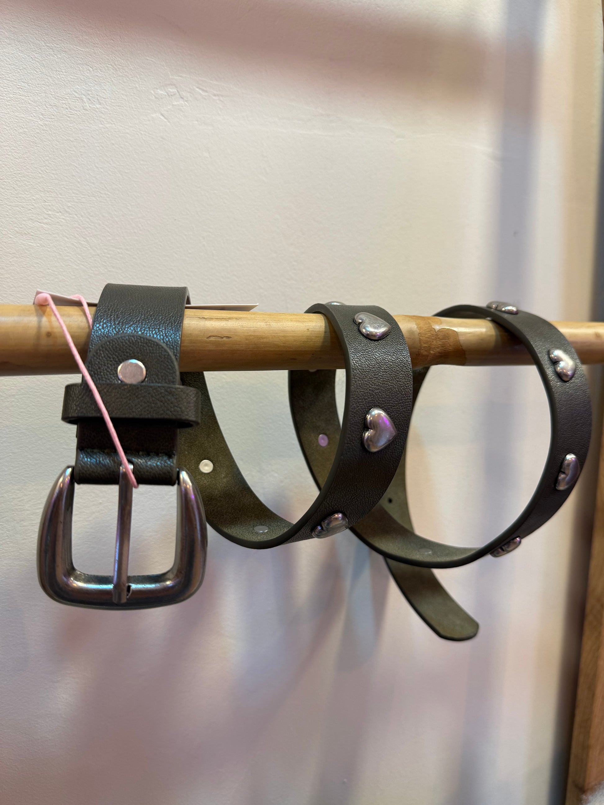 Este cinturón es el accesorio perfecto para añadir un toque especial y diferente a tus looks del día a día. Fabricado en tono verde oscuro con textura suave, está decorado con tachuelas metálicas en forma de corazón, que le dan un aire dulce pero con puntito cañero a la vez.