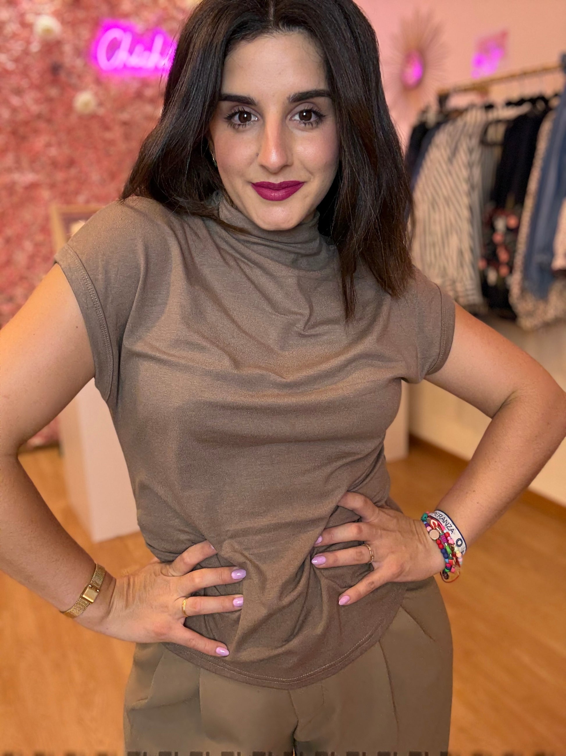 Tu básico elegante para todo el año. Aura tiene cuello chimenea suave con ligera caída drapeada, manga corta caída que estiliza el brazo y un tejido de viscosa elástica con tacto sedoso que se adapta sin marcar.