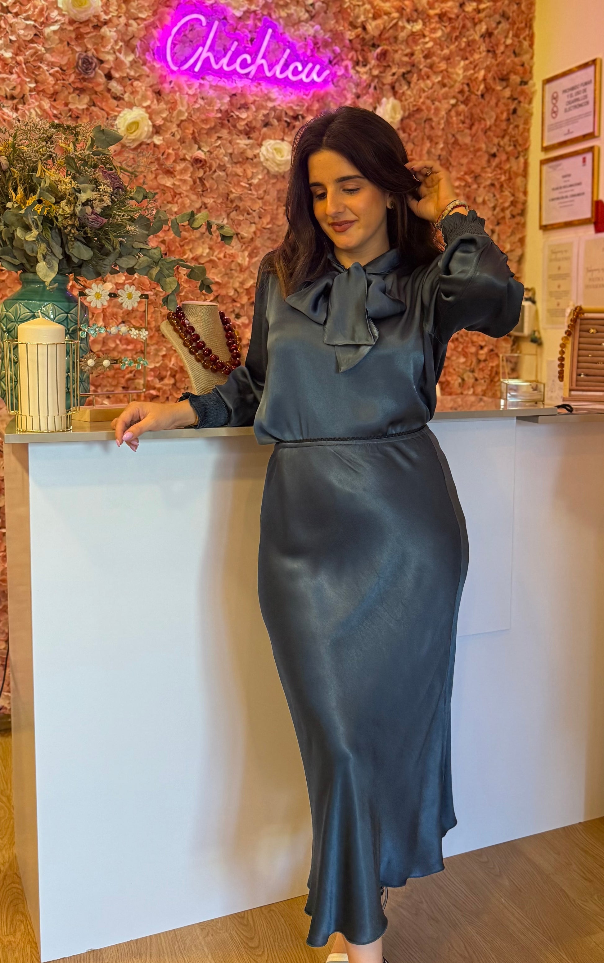 La falda satinada midi es la prenda estrella que no puede faltar en tu armario esta temporada. Confeccionada en 100% viscosa, combina ligereza, suavidad y un brillo satinado elegante que eleva cualquier look. Disponible en dos colores sofisticados: gris antracita y burdeos intenso, ambos perfectos para crear conjuntos tanto de día como de noche.