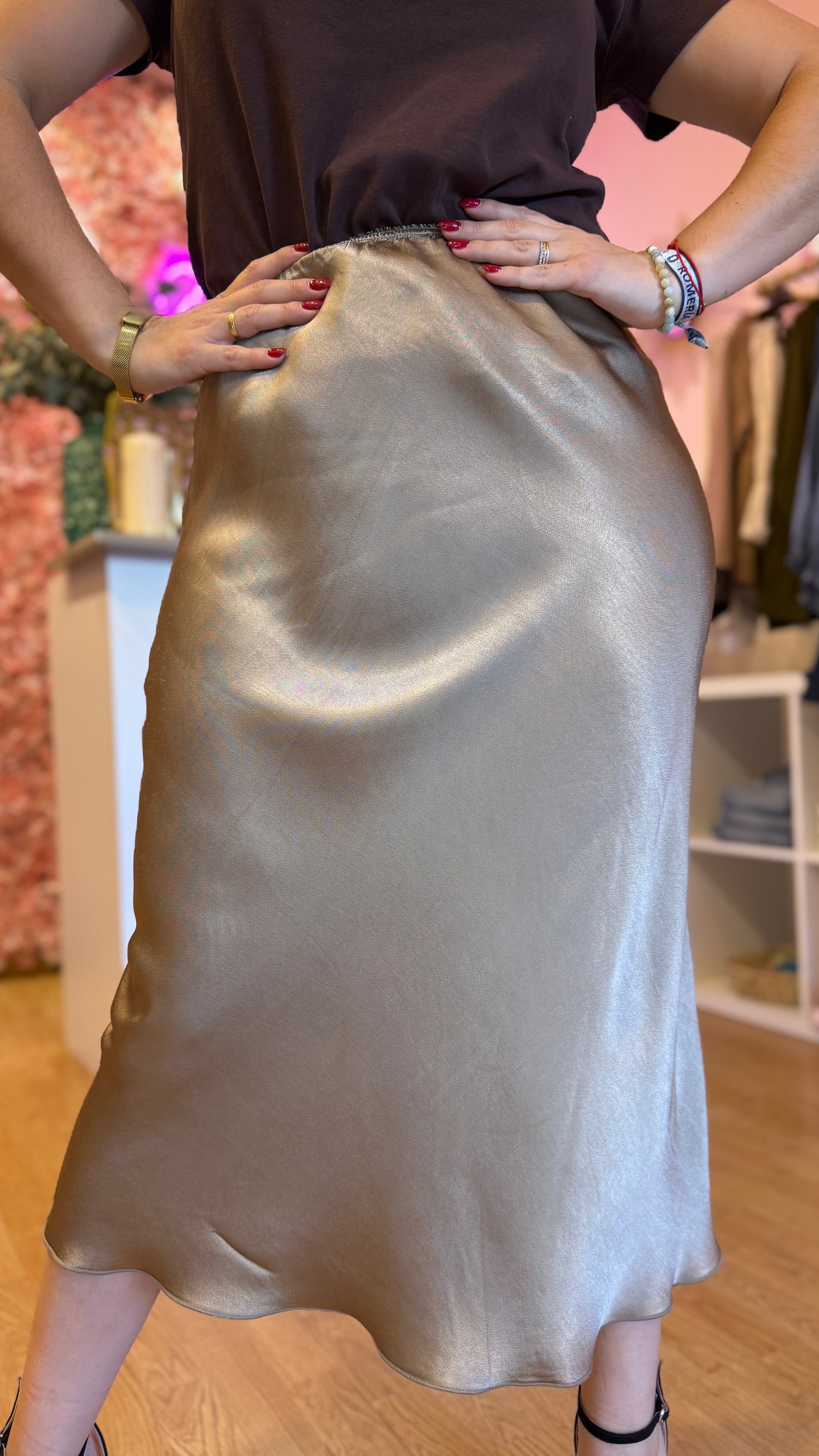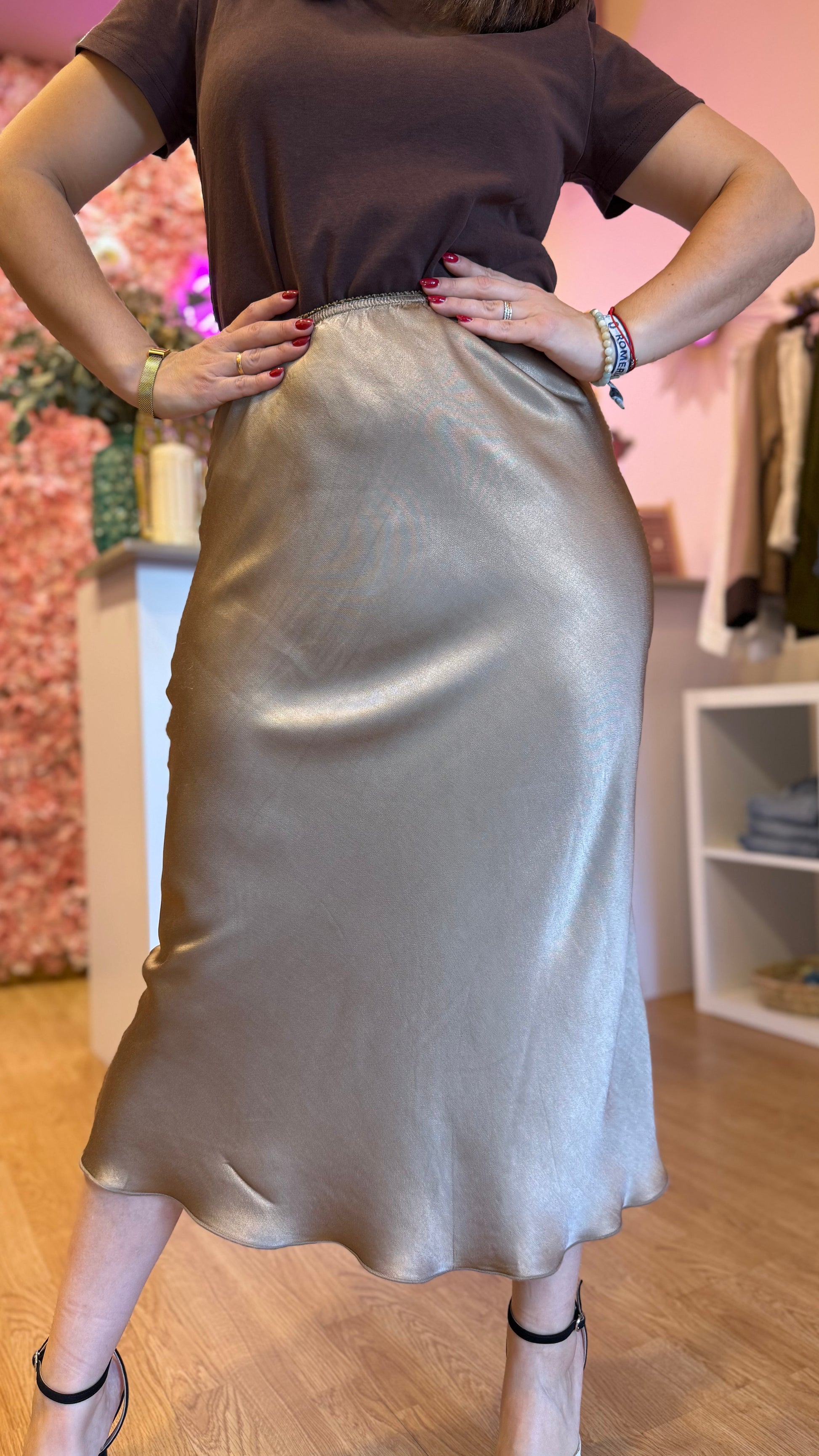 La falda satinada midi es la prenda estrella que no puede faltar en tu armario esta temporada. Confeccionada en 100% viscosa, combina ligereza, suavidad y un brillo satinado elegante que eleva cualquier look. Disponible en dos colores sofisticados: gris antracita y burdeos intenso, ambos perfectos para crear conjuntos tanto de día como de noche.