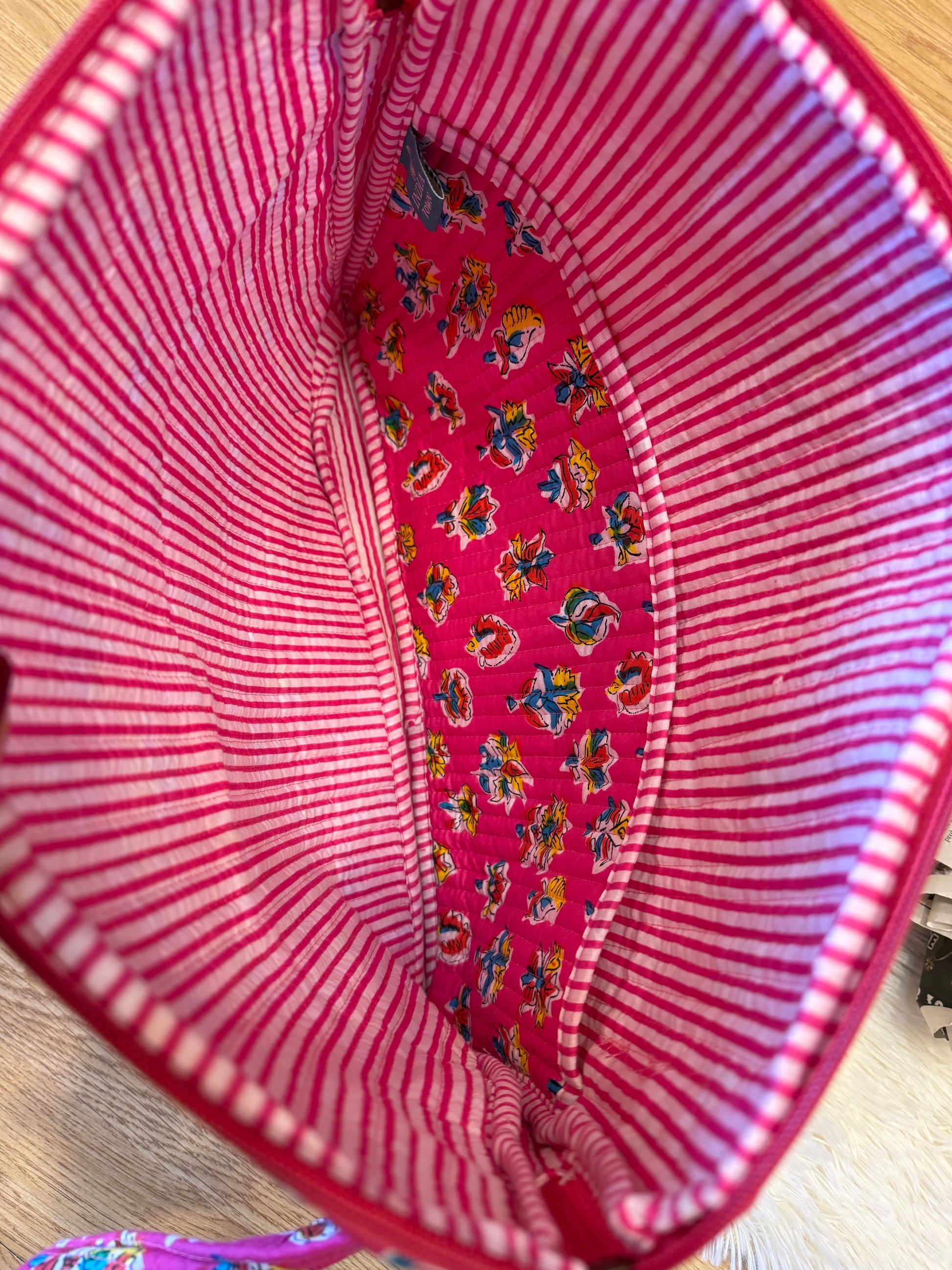 La funda está forrada con un interior de rayas en blanco y fucsia, que no solo es precioso sino que además aporta un acabado limpio y resistente. La parte central mantiene el estampado floral exterior, creando un contraste divertido y muy cuidado. Perfecta para quienes adoran los detalles bien hechos.