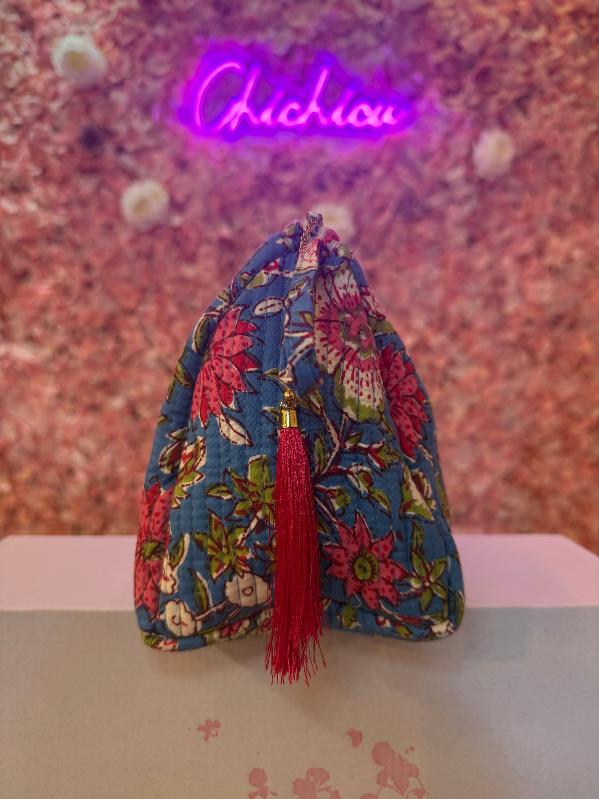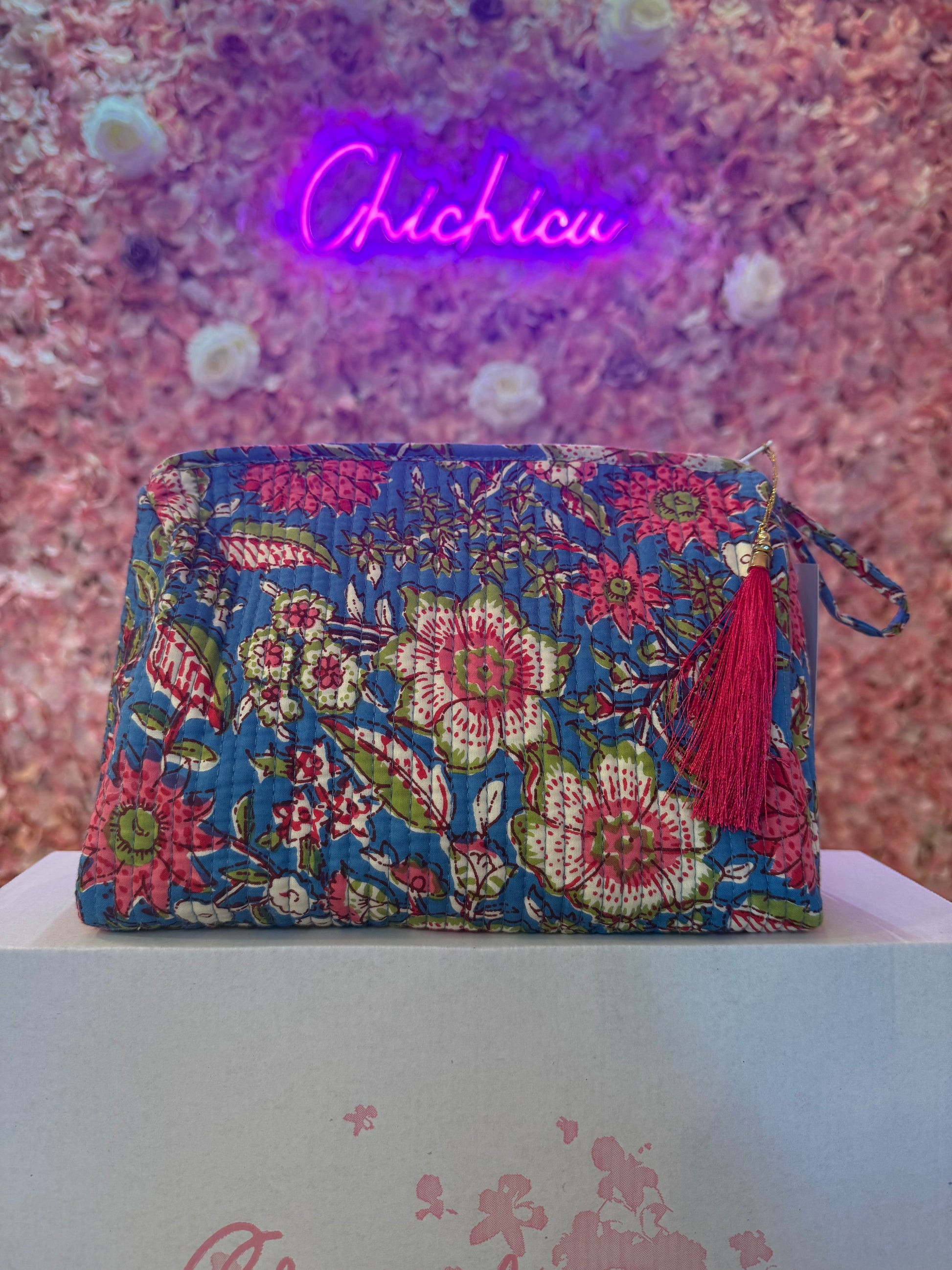 Este neceser de algodón acolchado es el complemento perfecto para mujeres que buscan estilo y funcionalidad en un solo accesorio. Su estampado floral en tonos vivos y su diseño con borla decorativa lo convierten en una pieza única, ideal para llevar en el bolso, en la maleta o para dejar a la vista en casa.