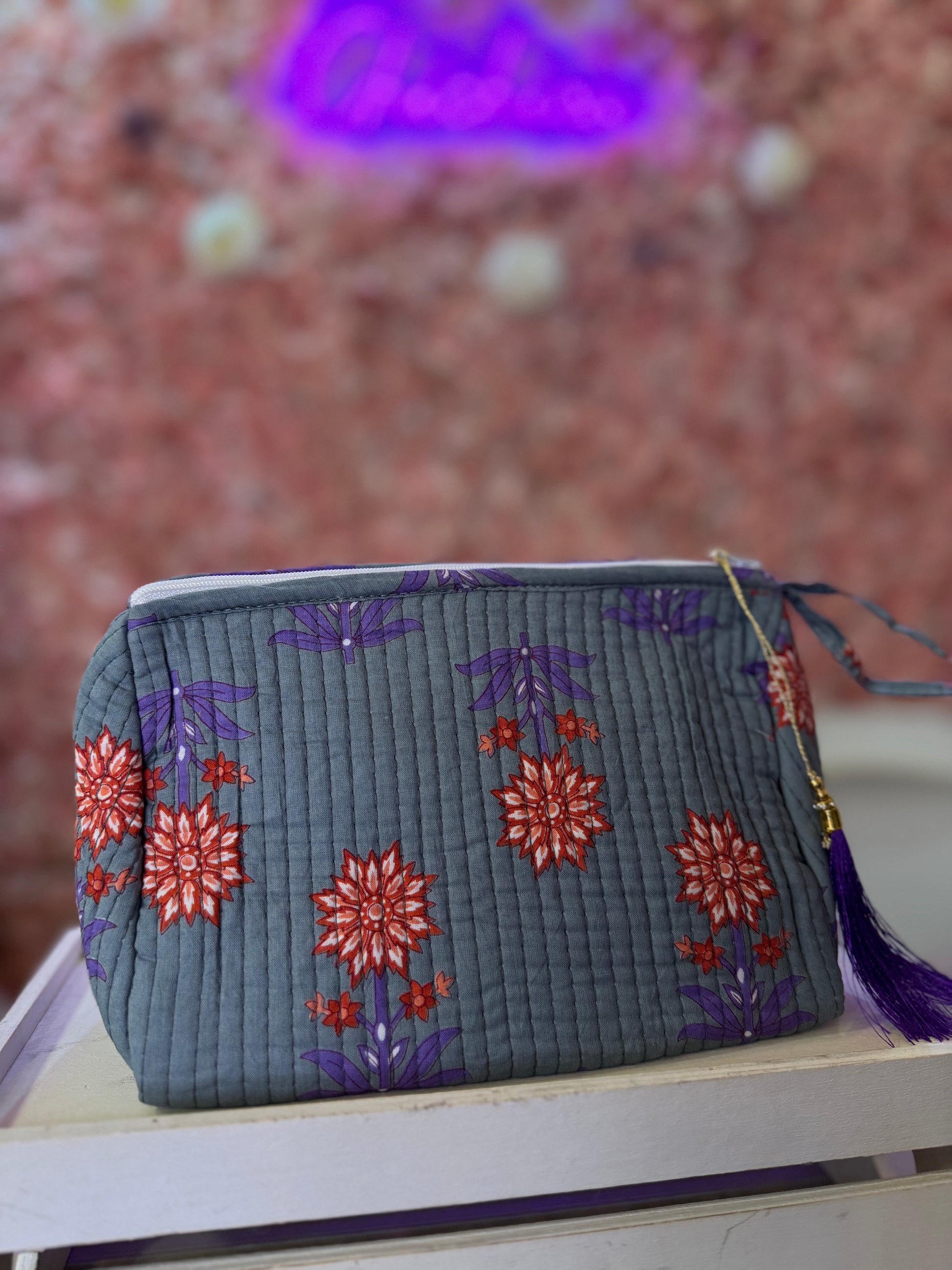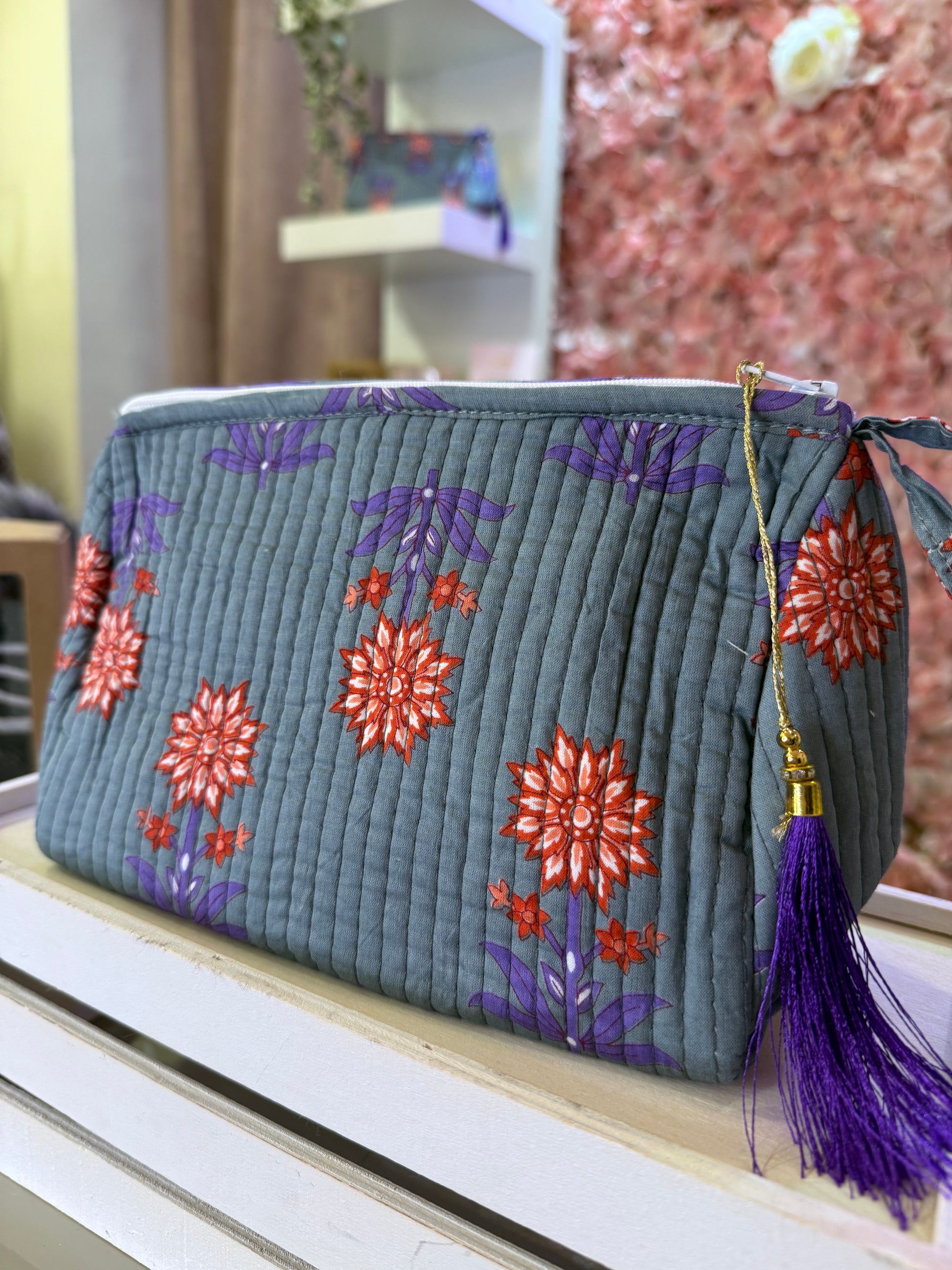 Este neceser de algodón acolchado es el complemento perfecto para mujeres que buscan estilo y funcionalidad en un solo accesorio. Su estampado floral y su diseño con borla decorativa lo convierten en una pieza única, ideal para llevar en el bolso, en la maleta o para dejar a la vista en casa.