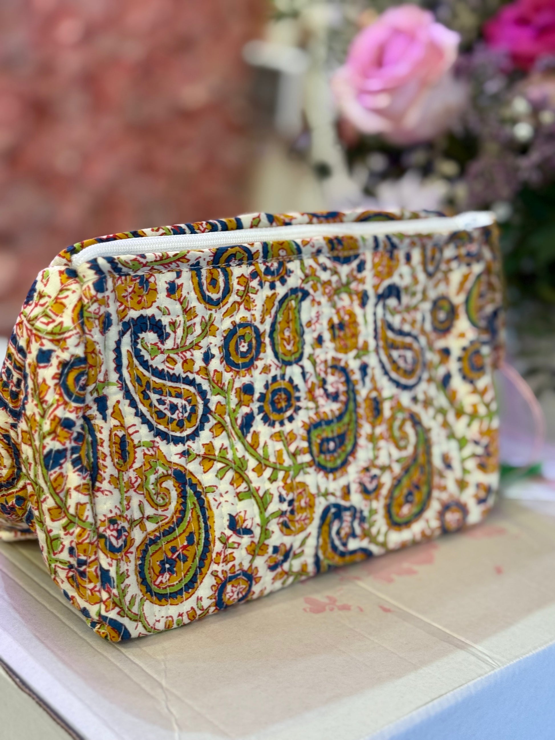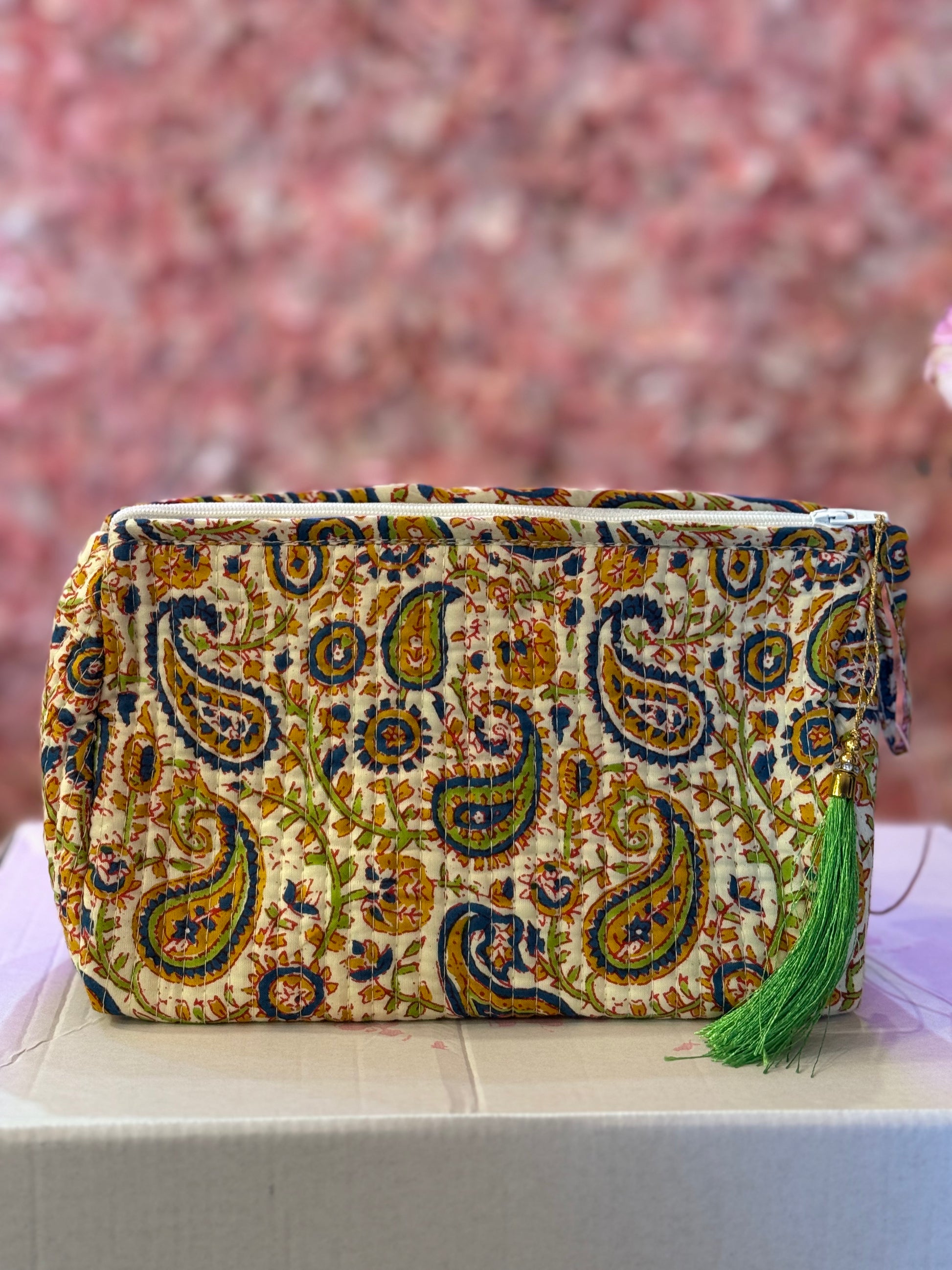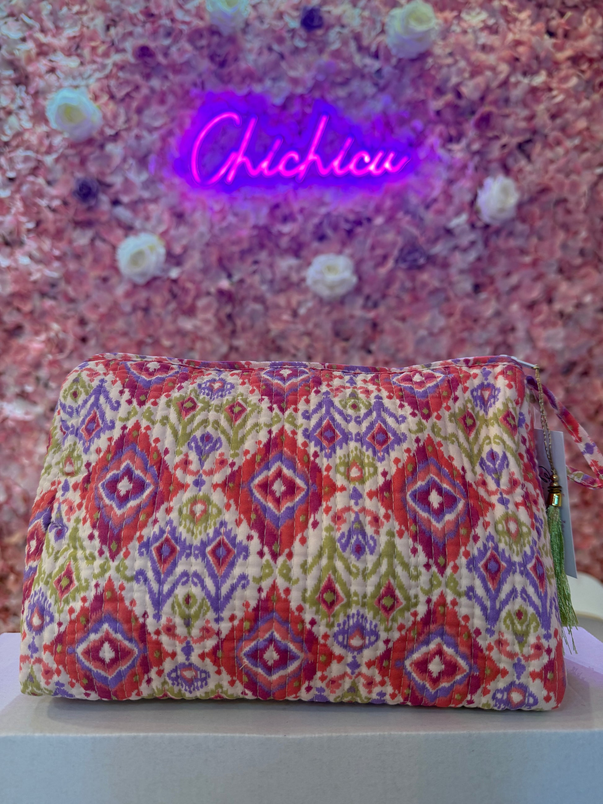 Este neceser de algodón acolchado es el complemento perfecto para mujeres que buscan estilo y funcionalidad en un solo accesorio. Su estampado floral en tonos vivos y su diseño con borla decorativa lo convierten en una pieza única, ideal para llevar en el bolso, en la maleta o para dejar a la vista en casa.