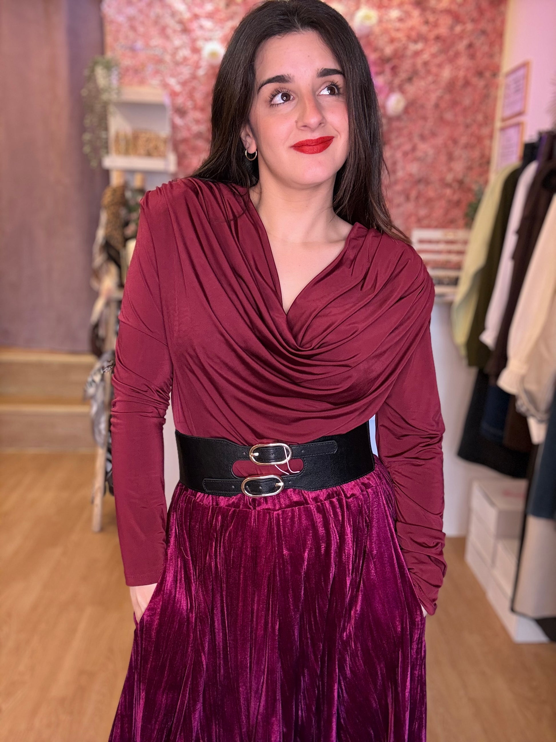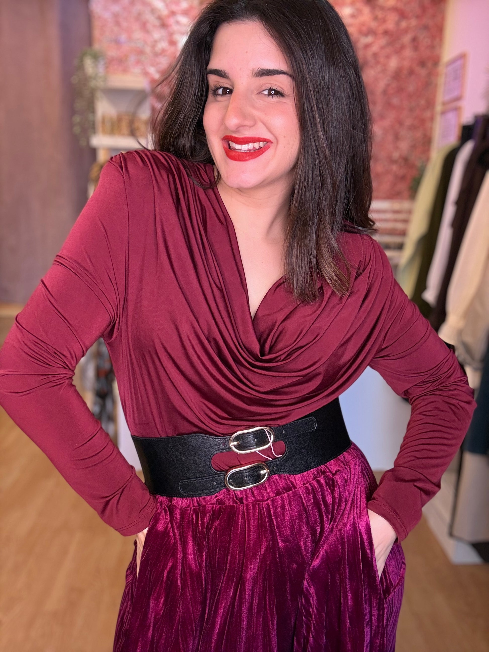 El tejido —suave, flexible y ligeramente satinado gracias a su 93% poliéster y 7% elastano— cae en un escote drapeado que parece fluir por sí mismo, como un movimiento lento y seguro. Es cómodo, favorecedor y sedoso al tacto, de esos tops que te recuerdan que la belleza también puede sentirse.
