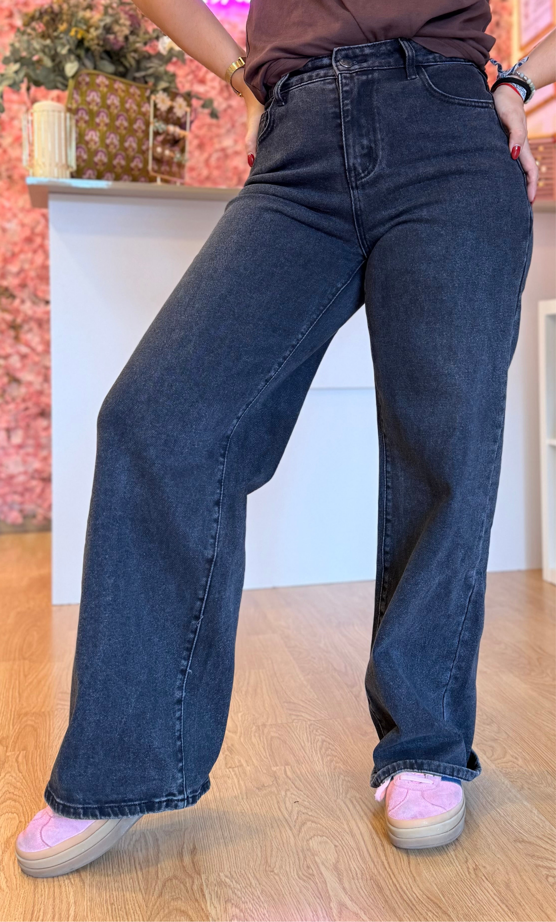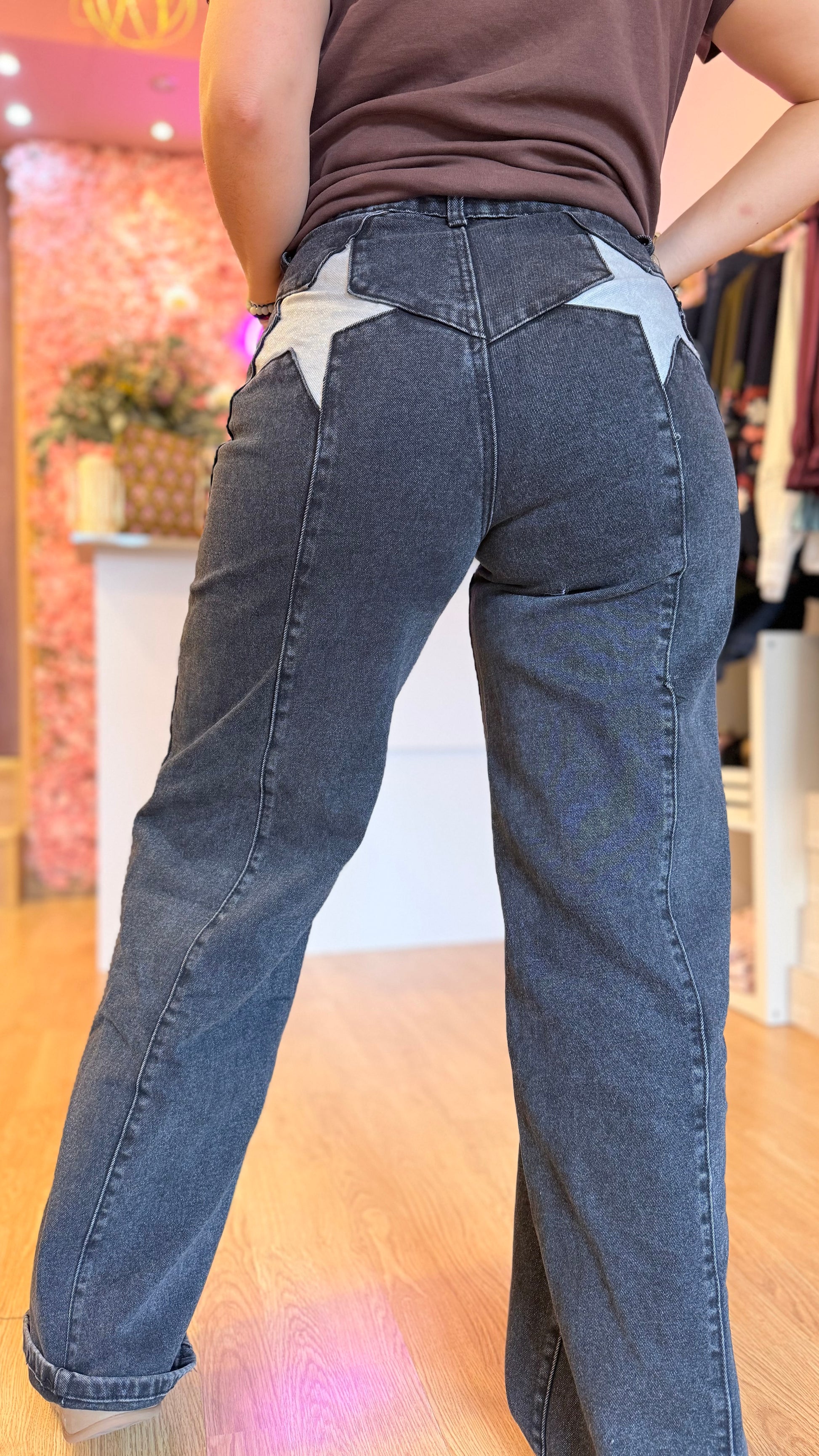 Este vaquero negro de corte recto con detalle de estrella en la parte trasera es la prenda perfecta para quienes buscan un look cómodo pero con personalidad. Su diseño favorecedor realza la silueta y aporta un aire moderno y juvenil, ideal tanto para el día a día como para crear outfits más especiales.
